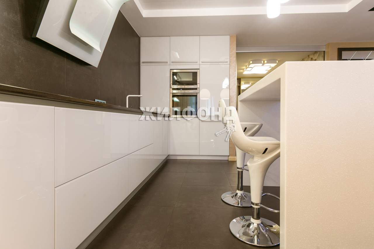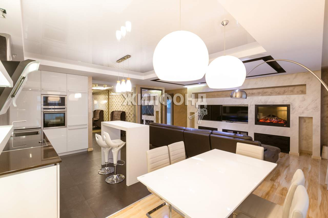 Кухня-гостиная в стиле хай-тек, площадь 43 кв. м. Функциональное зонирование Два больших окна, выход на вторую огромную лоджию, площадь которой 9 кв. м. С высоты 14 этажа открывается прекрасный вид на центр Новосибирска.